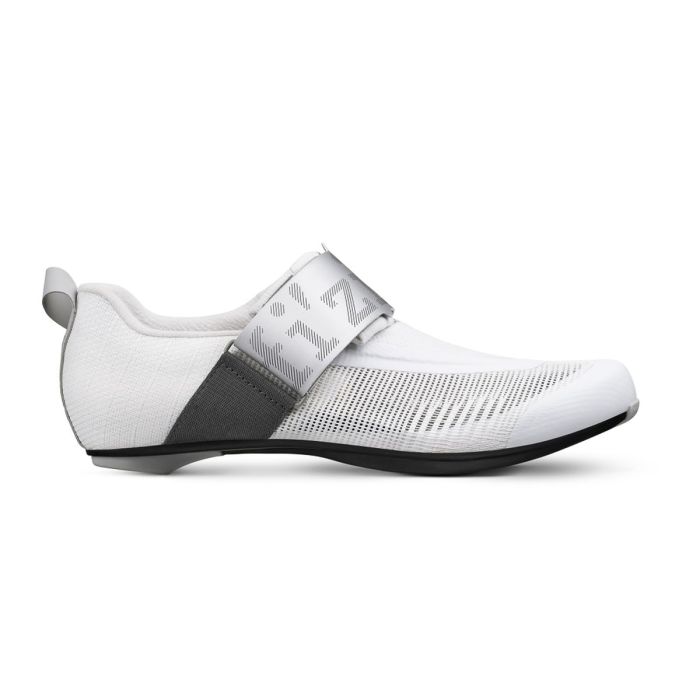 Fizik Transiro Hydra Aeroweave Carbon on huippuluokan triathlon-pyöräilykenkä, joka yhdistää innovatiivisen toisen sukupolven Aeroweave-päällisen ja jäykän R2-hiilikuitupohjan. Aeroweave-päällinen on erittäin hengittävä ja kevyt, sillä se yhdistää nailonkuidut termoplastisiin polymeerifilamentteihin, tarjoten samalla tarvittavan tuen kilpailutilanteissa. Tämä pehmeämpi rakenne sopii erityisesti urheilijoille, jotka suosivat pyöräilyä ilman sukkia. R2-hiilikuitupohja on suunniteltu säästämään painoa ja lisäämään jäykkyyttä, saavuttaen jäykkyysindeksin 10, mikä tekee siitä Fizikin valikoiman reaktiivisimman pohjan. Leveä ilmanottoaukko ja syvät sisäiset kanavat tarjoavat viilentävää ilmavirtausta, auttaen lämpötilan säätelyssä. Klossien asento on hieman taempana perinteisiin asetuksiin verrattuna, optimoiden polkemistehokkuuden ja vähentäen polvien rasitusta – erityisesti triathlonisteille, jotka omaksuvat aggressiivisia, eteenpäin suuntautuvia aerodynaamisia asentoja. Yksittäinen tarranauhakiinnitys mahdollistaa nopeat ja huolettomat vaihdot, joissa jokainen sekunti on ratkaiseva. Tämä kiinnitysjärjestelmä tarjoaa myös vahvan tuen jalalle, varmistaen tehokkuuden kaikissa kilpailutilanteissa. Paino: 225 g (koko 44).