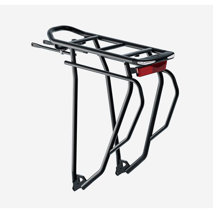 Racktime Gleamit 2.0 Tour on monipuolinen ja tyylikäs takatavarateline, joka yhdistää käytännöllisyyden ja modernin muotoilun. Se on yhteensopiva 26"–28" pyörien kanssa ja tukee Snapit 2.0 -järjestelmää, mikä mahdollistaa helpon ja turvallisen kiinnityksen. Telineessä on integroitu Trelockin valmistama takavalo, joka toimii 5–15 voltin jännitteellä ja sisältää pysäköintivalotoiminnon. Tour-malli tarjoaa toisen tason sivulaukuille, mikä lisää kuljetuskapasiteettia. Valmistettu kestävästä 14 mm alumiiniputkesta, teline kestää enintään 25 kg kuorman. Sen paino on noin 830 g, ja se on saatavilla klassisessa mustassa värissä.